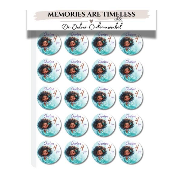 Maak een verjaardag of traktatie extra bijzonder met deze vrolijke zeemeermin stickers! Het ontwerp toont een prachtig meisje met donkere huidskleur en zwarte krullen, zodat kinderen met verschillende achtergronden zich kunnen herkennen in deze vrolijke stickers.