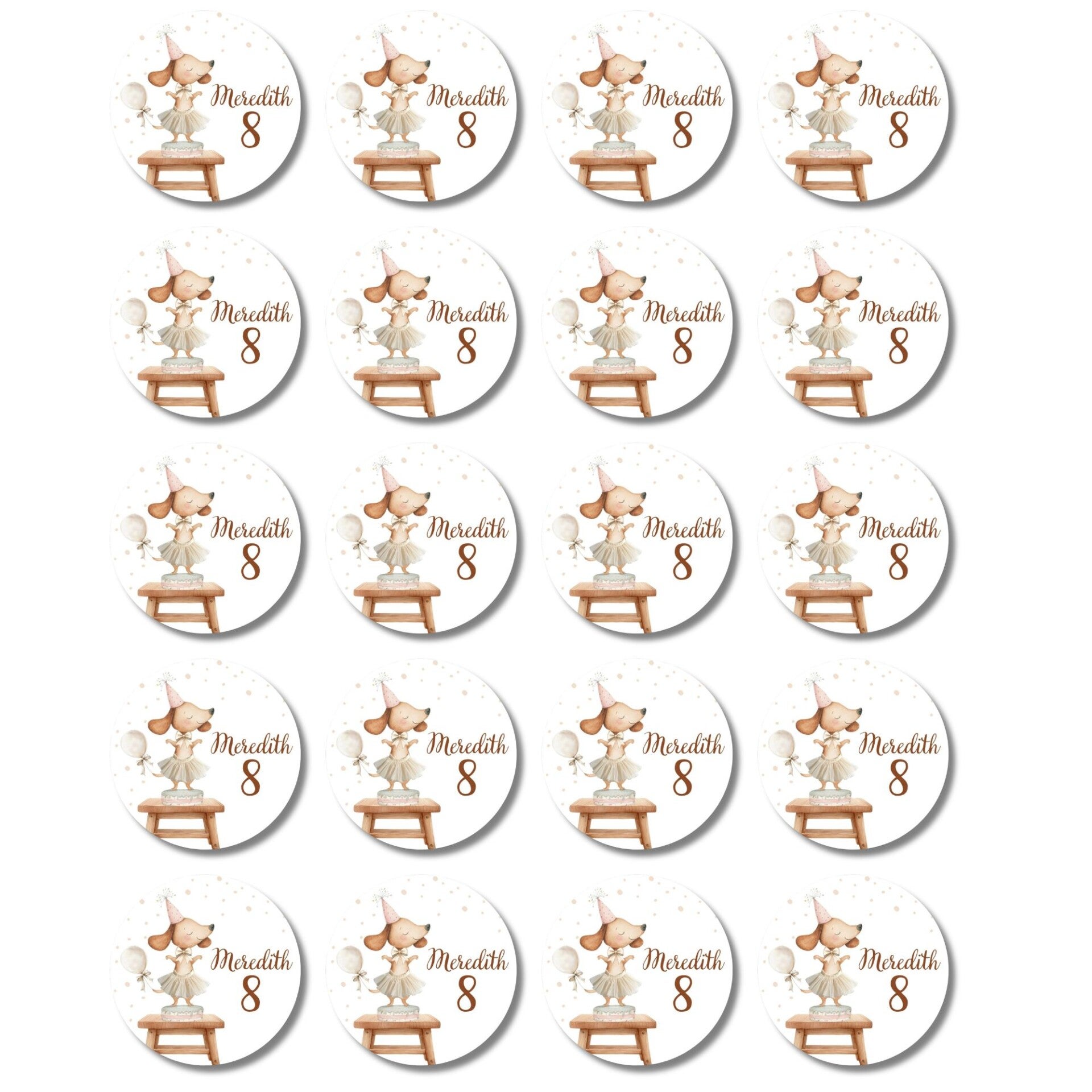 Wil je een verjaardag extra persoonlijk en feestelijk maken? Met deze gepersonaliseerde stickers met naam en leeftijd maak je van elke traktatie en elk cadeautje iets bijzonders. Het vrolijke ontwerp met een teckel hondje met ballon, een feesthoed, een rokje en een strik, staand op een taart, zorgt voor een echte feestuitstraling.