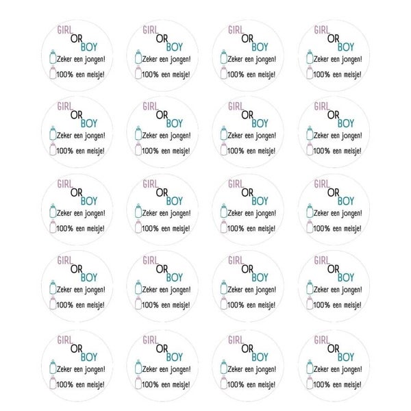 Maak je gender reveal party, babyshower, zwangerschapsaankondiging of zwangerschapscadeautje compleet met deze set van 20 stickers! Stickers bedrukt met de teksten "Girl Or Boy" "Zeker Een Jongen!" "100% een meisje!"