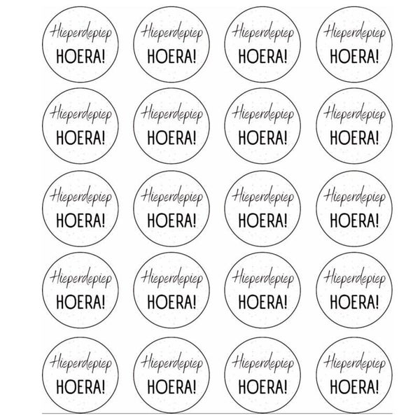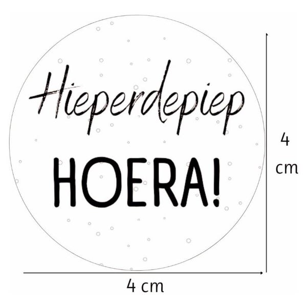 Hieperdepiep Hoera! Maak de verjaardagscadeautjes of een traktatie helemaal speciaal met deze set van 20 sluitstickers! Een ronde witte sticker bedrukt met de tekst "Hieperdepiep Hoera!".
