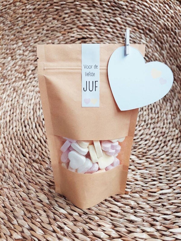 Verras de juf met dit stevige kraft cadeauzakje gevuld met lekkere vruchtenhartjes. Het zakje heeft een handig venster en wordt afgesloten met een sluitsticker waarop staat “De liefste juf”.