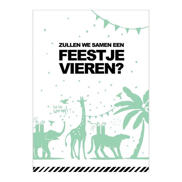 Een A6 ansichtkaart van 350 grams papier full color bedrukt. Op de achterzijde kan alle informatie over het feestje ingevuld worden.
