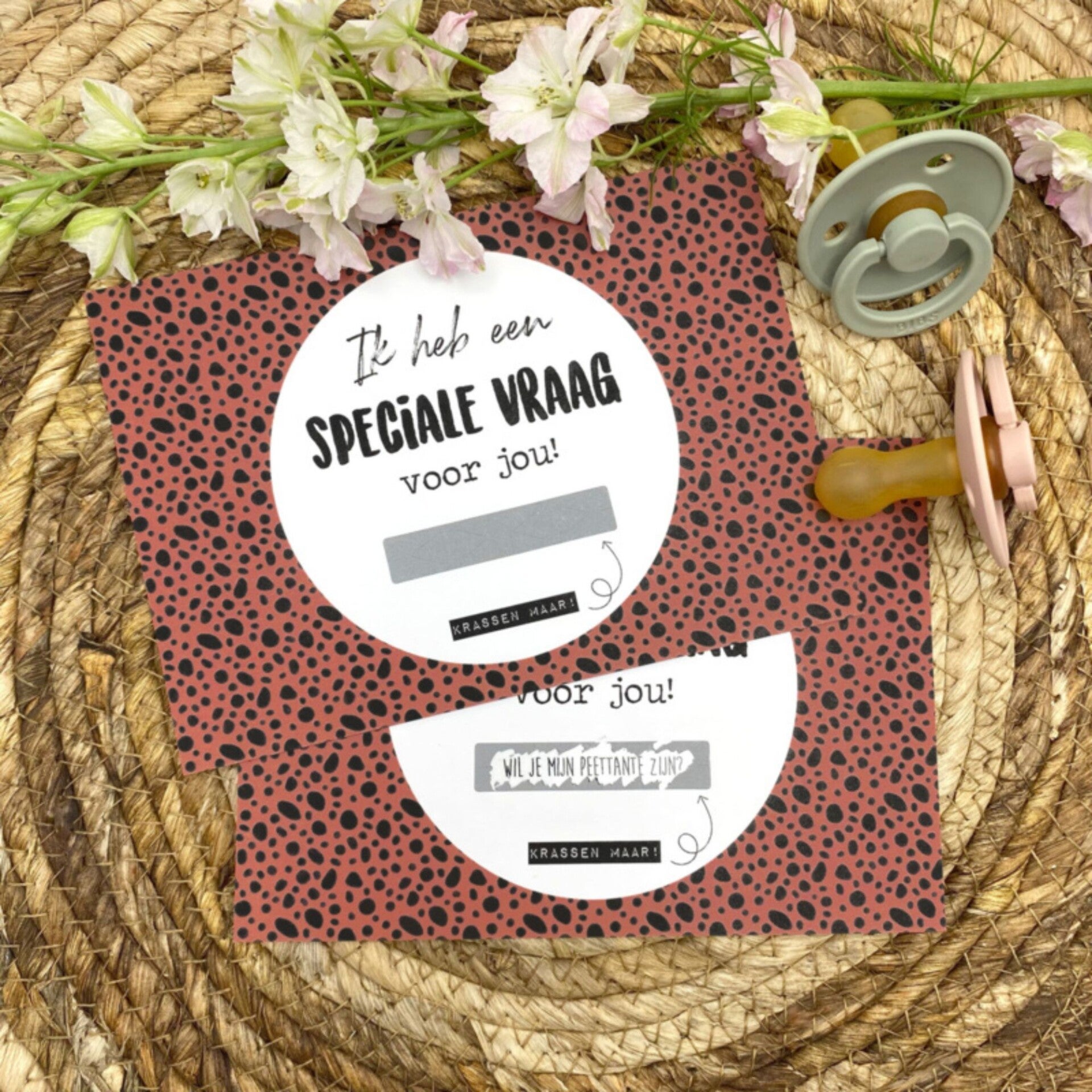 Een leuke manier is deze kraskaart. Onder het kraslaagje staat de tekst. De tekst "Wil je mijn peettante worden?" wordt pas zichtbaar na het wegkrassen met een muntje of nagel. Wat een verrassing!
