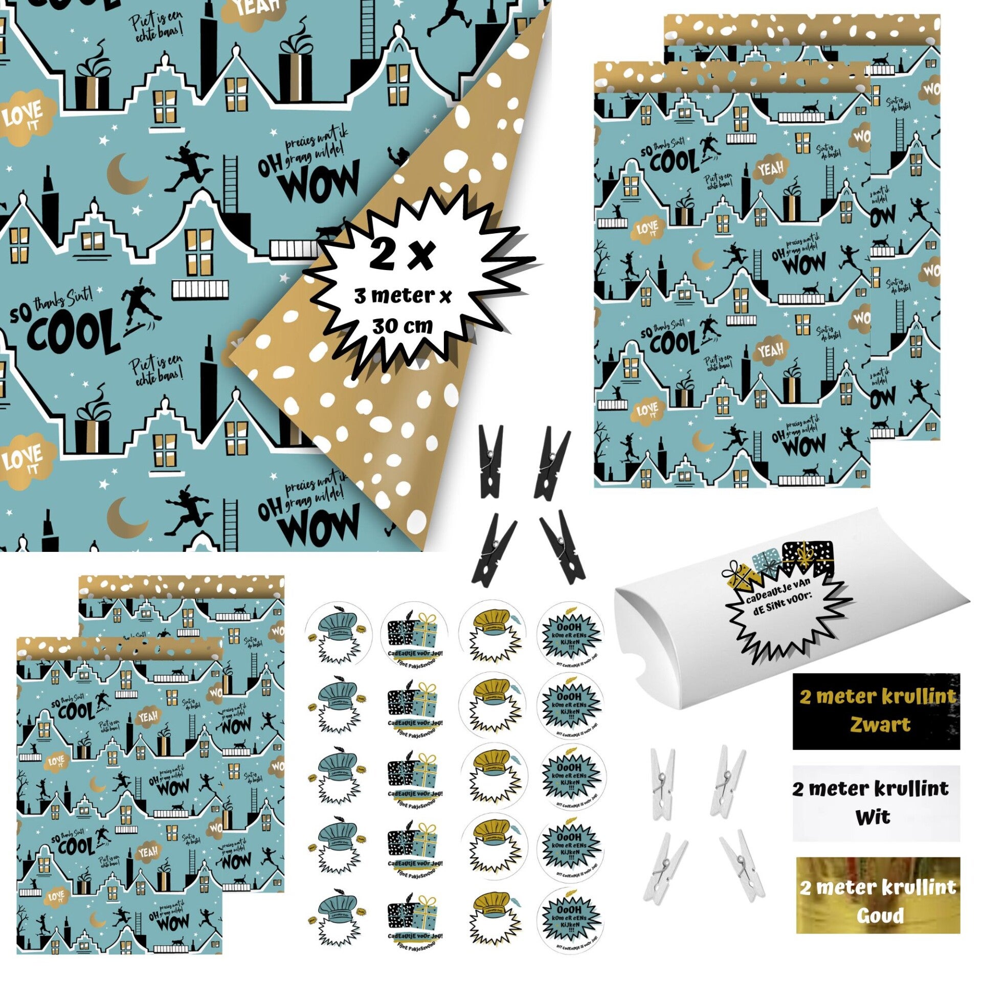 Sinterklaas 38-delige inpakset in de kleuren groen, blauw, petrol, wit, goud en zwart. Het heerlijk avondje komt eraan en daar horen cadeautjes bij. Natuurlijk het liefst mooi ingepakte cadeautjes. Met deze uitgebreide inpakset zit je altijd goed!