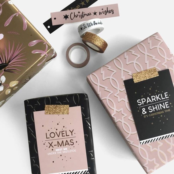 Door het gebruik van cadeaustickers en labels komt dit papier helemaal prachtig uit. Op de binnenzijde heeft dit papier een mooie sparkle met gouden bijpassende glitters.