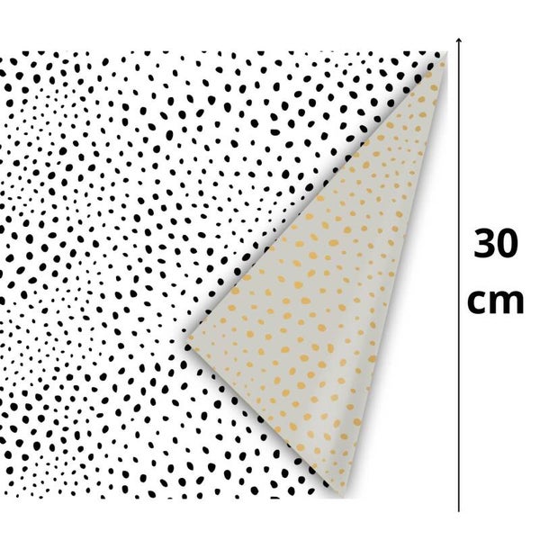 Dubbelzijdig cadeaupapier in de kleuren zwart wit en goud. De ene zijde van het papier is wit met zwarte stippen, de andere zijde is champagne grijs met gouden stippen.