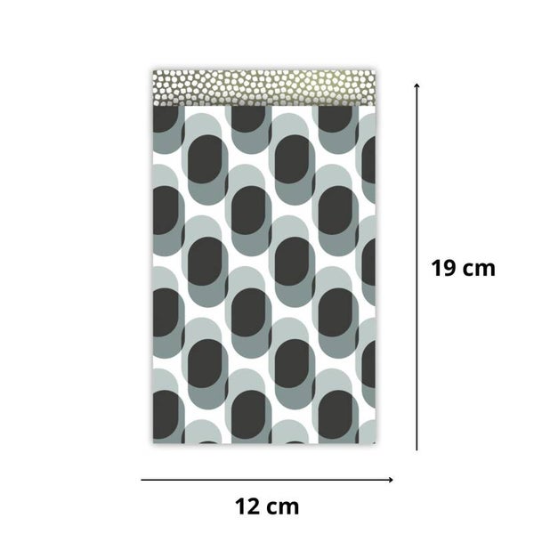 Deze cadeauzakjes maak je een flashback naar de seventies! Deze papieren zakjes hebben een mooie mat / glans combinatie op de buitenkant. De zwarte vormen zijn voorzien van een glanslaagje. De binnenkant van de zakjes hebben een bijpassende metallic voor het chique gevoel.